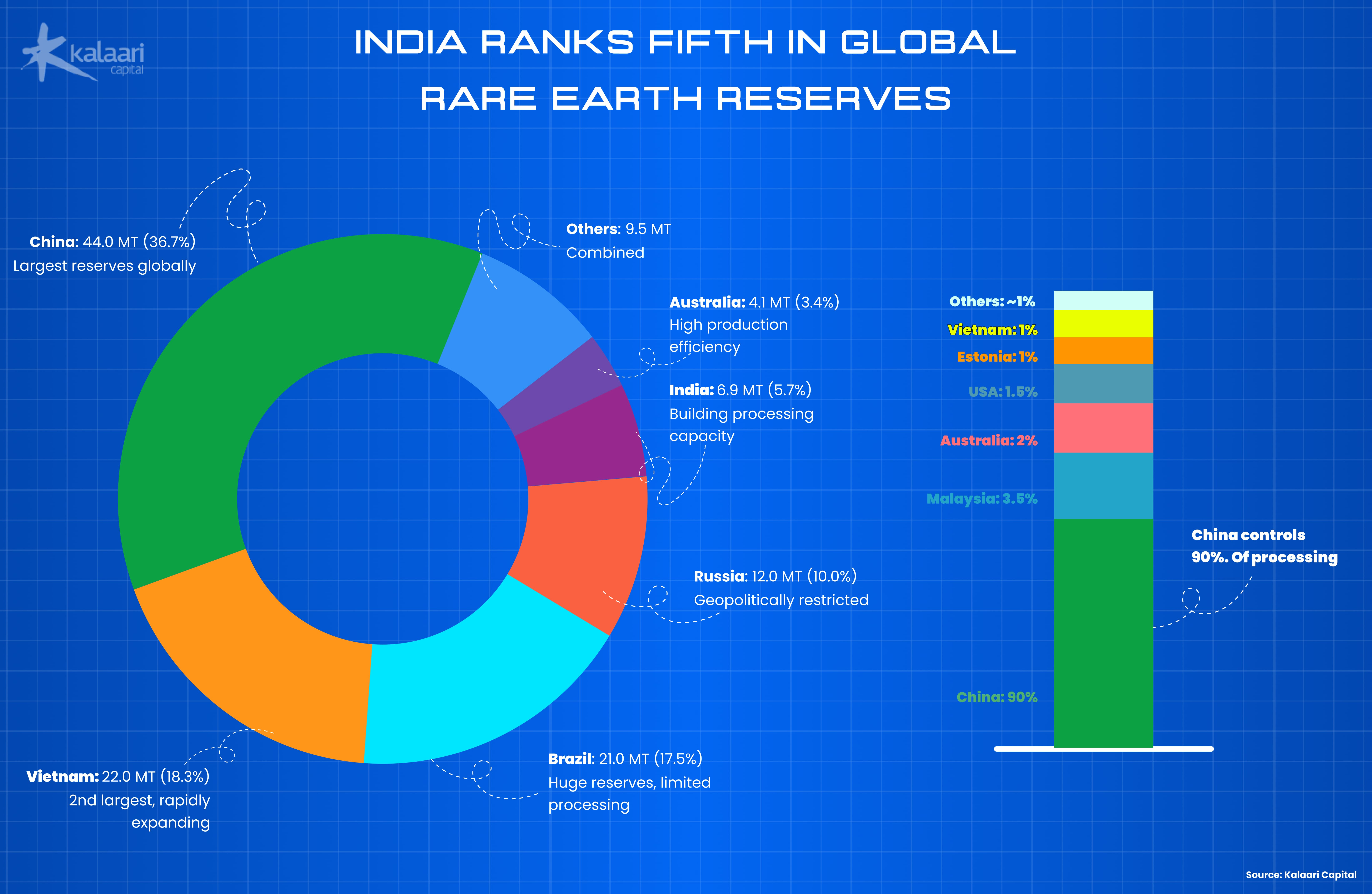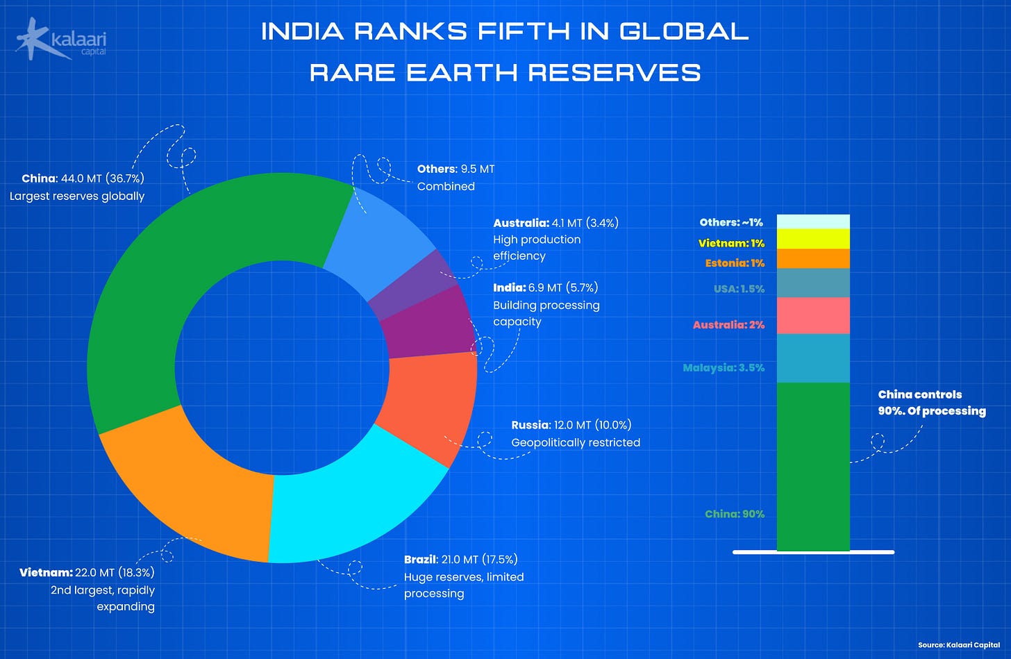 Supply and Policy: India has one of the world’s largest REE reserves, with an estimated 6.9 million tonnes of Rare Earth Elements Oxide. Policy is catching up, led by the ₹16,300 crore National Critical Mineral Mission and bilateral agreements with countries like Australia and Japan. The GoI is now putting in the effort to see what can be mined and processed locally.